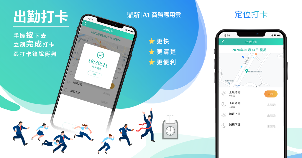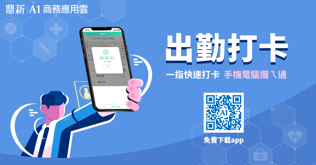 鼎新A1出勤打卡 雲端辦公最佳選擇 一指快速打卡! 工具名稱:鼎新A1出勤打卡 不需打卡機,立刻定位打卡 連網即用,手機電腦攏ㄟ通 多元學習,線上客服快速排除疑難 工具特色 ▎簡單、易操作的打卡助理 ▎上班免排隊,手機按下去,即可定位打卡 ▎網頁設定30秒就OK,輕鬆掌握每日出勤時間與地點 ▎即時上傳打卡紀錄,隨時可查詢,計算時數更快速